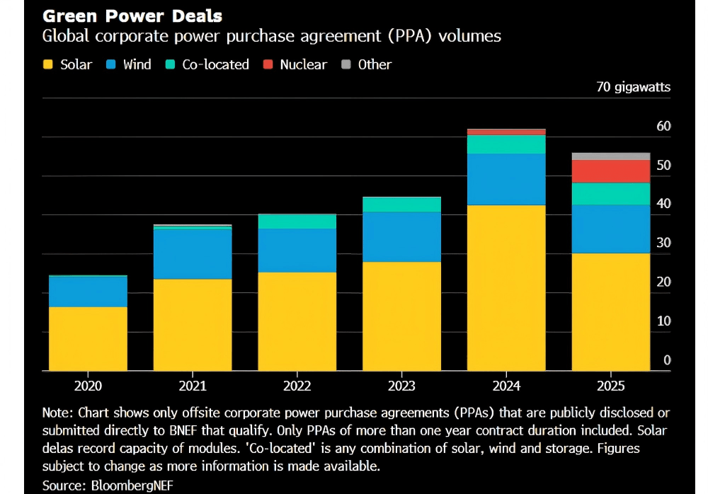 Corporate demand, especially from power-intensive technology companies, has become a dominant force in clean energy deployment. In 2025, tech leaders Meta, Amazon, Google, and Microsoft accounted for roughly half of the 56 gigawatts of clean power purchase agreements (PPAs) signed globally. In the United States, these corporate deals constituted 76% of the total 30-gigawatt PPA market. According to industry analysts, this corporate demand is crucial for supporting not only established renewables but also emerging firm power generation technologies, such as enhanced geothermal, advanced nuclear, and co-located solar-storage projects. Beyond tech, materials giants like Egypt Aluminium and Rio Tinto also ranked among the top ten corporate clean energy buyers in 2025, even as activity slowed in some European markets due to policy and price uncertainty.